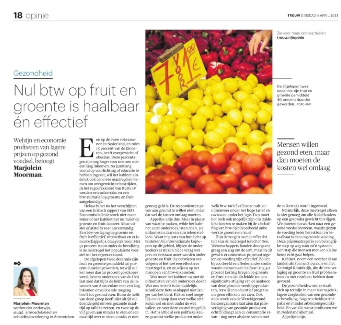 Welzijn én economie profiteren van het goedkoper maken van groente en fruit, betoogde ik samen met een grote groep wetenschappers. Lees het hele opinie-artikel in Trouw hier terug.